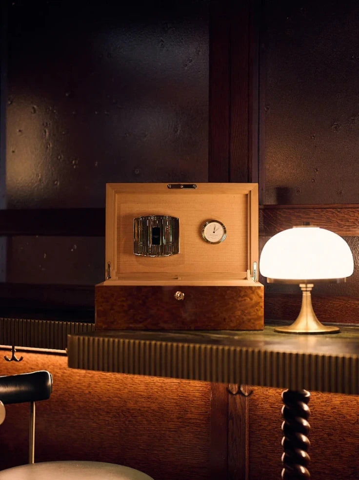 This humidor elevates the cigar experience with an elegant burr walnut exterior and premium American cedar lining. Built-in chrome-plated hygrometer and humidifier ensure perfect humidity, while dual-compartment trays store up to 25, 50, or 100 cigars, blending luxury design with expert craftsmanship for the discerning aficionado.