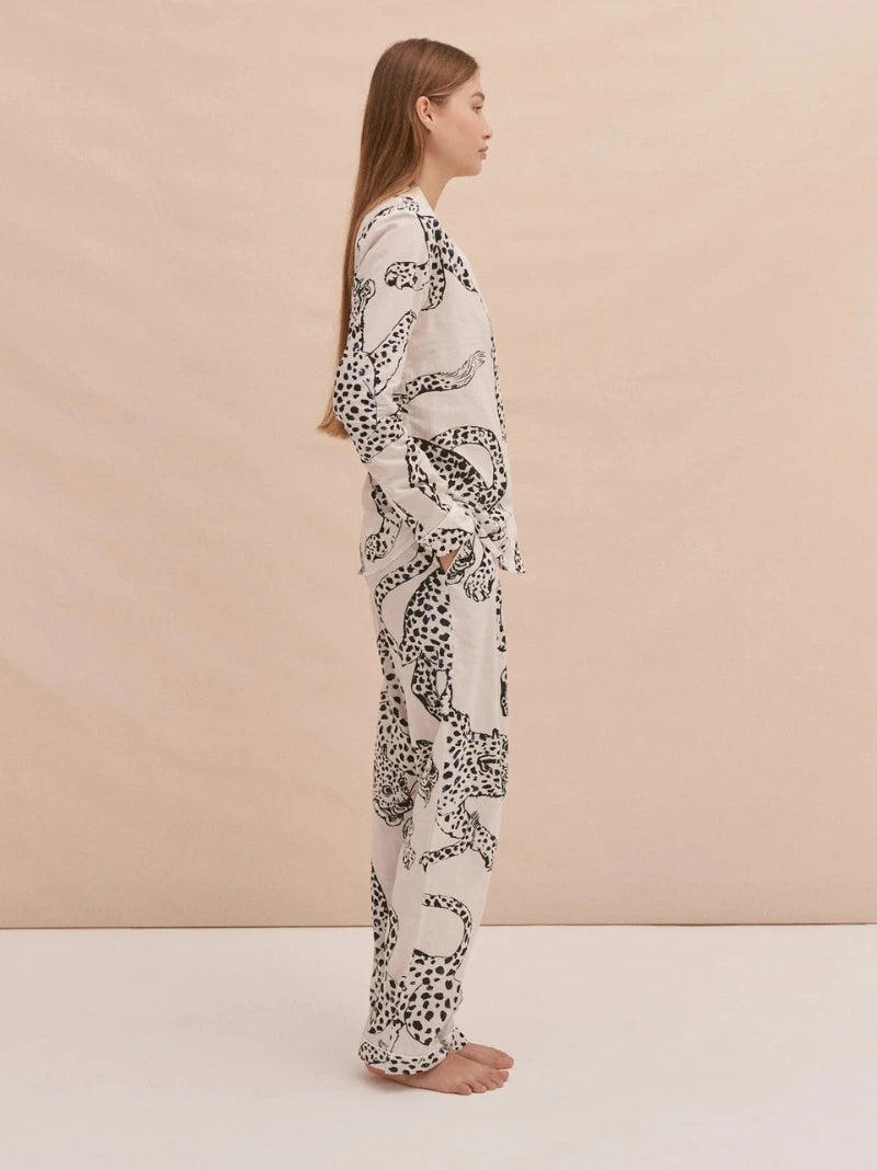 A polished take on the traditional long pyjama set, this tailored leopard silhouette is designed to feel both timeless and modern. The shirt features a sculpted hemline, buttoned cuffs, and subtle piping along the rounded lapels, pocket, and cuffs, while the trousers balance comfort and structure with deep pockets, an elasticated waistband with tie, and a softly tapered leg that stays in place throughout the night. Finished with personalisation, it’s a piece that makes even the quietest moments feel considered.