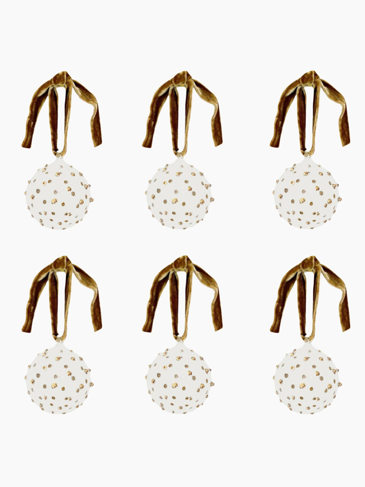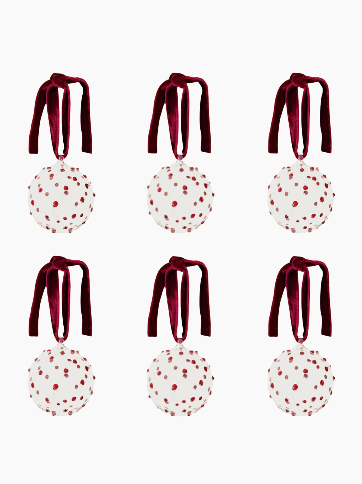 A set of 6 handblown detail Christmas baubles, designed in England and made by Egyptian artisans in Cairo. Each ornament features a playful dotty pom design and is finished with a luxurious velvet ribbon, arriving in a chic Christmas box.