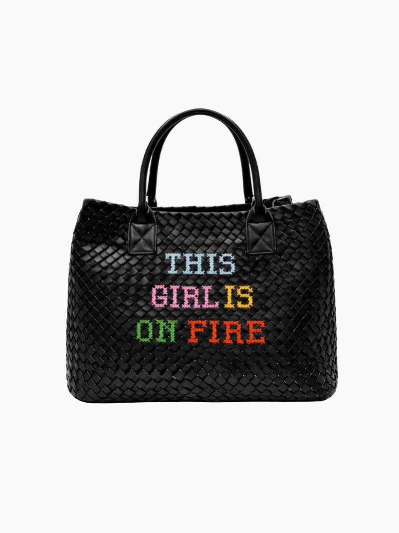 Handmade from buttery soft, hand-woven vegan leather, this embroidered bag is equal parts functional and statement-making. With a roomy interior and a detachable inner pouch, it’s designed to carry you from busy days to relaxed weekends with ease.